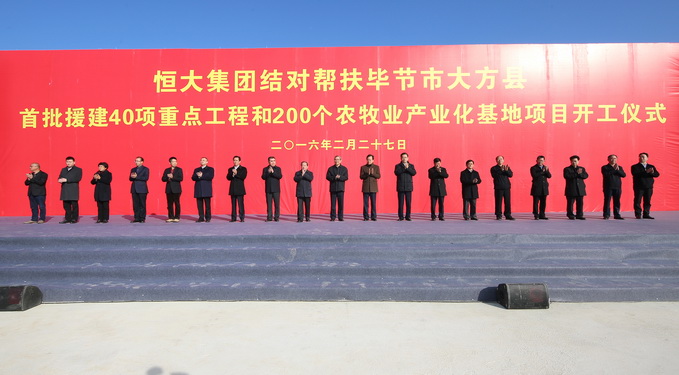 在全国政协的领导下,2月27日,恒大集团结对帮扶大方县首批援建工程项目开工仪式在毕节市大方县举行,40项重点工程和200个农牧业产业化基地项目同时正式开工。