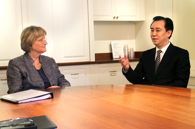 据新华网报道,美国当地时间10月8日上午10点半,哈佛校长凯瑟琳·德鲁·吉尔平·福斯特(Catharine Drew Gilpin Faust)女士在哈佛大学马萨诸塞大厅会见了来访的恒大集团董事局主席许家印教授一行,双方进行了深入交流与会谈。