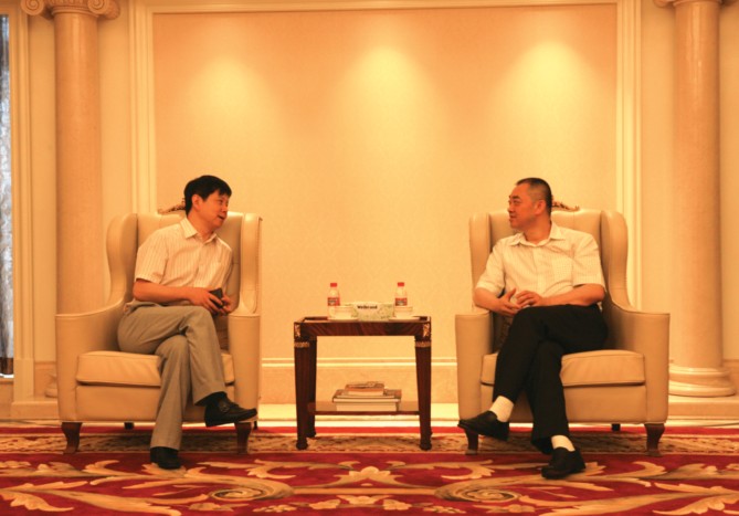 恒大集团董事局副主席、总裁夏海钧博士与西安市曲江新区大明宫遗址保护办主任倪明涛(左)亲切交谈